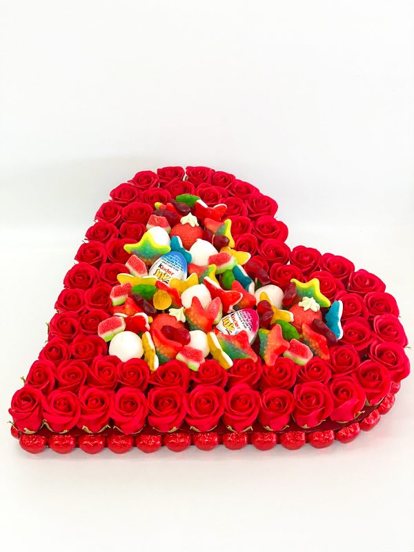 ורדים אדומים עם מבחר שוקולדים בצורת לב
